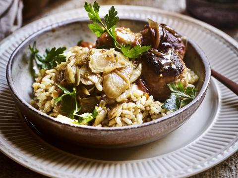 Rijstbowl met witloof, gehaktballetjes en saus van Luikse siroop