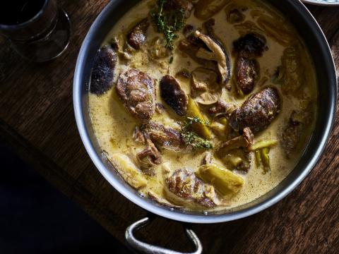 Romig stoofpotje van varkenswangen met boschampignons en prei