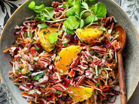 Croque met kruidenkaas, warmgerookte zalm en gepekelde radijs en een rauwkostsalade met wortel, radijs en wittekool