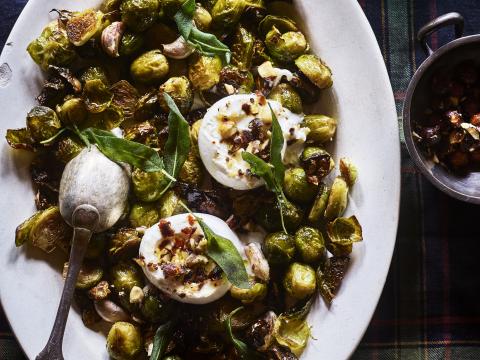 Geroosterde spruiten met burrata en gekaramelliseerde hazelnoten