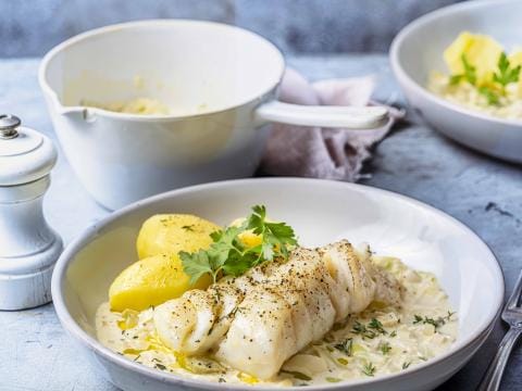Gebakken tarbot met geroosterde honingwortelen, aardappelroosjes en sinaasappelboter