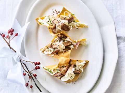 Minitaco’s met gelakte eend en een koolrabislaatje