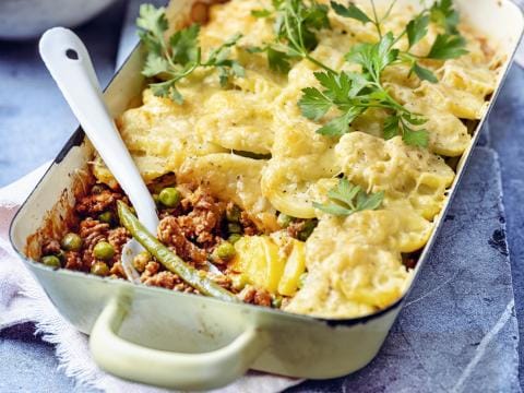 Ovenschotel met gehakt, boontjes en erwtjes